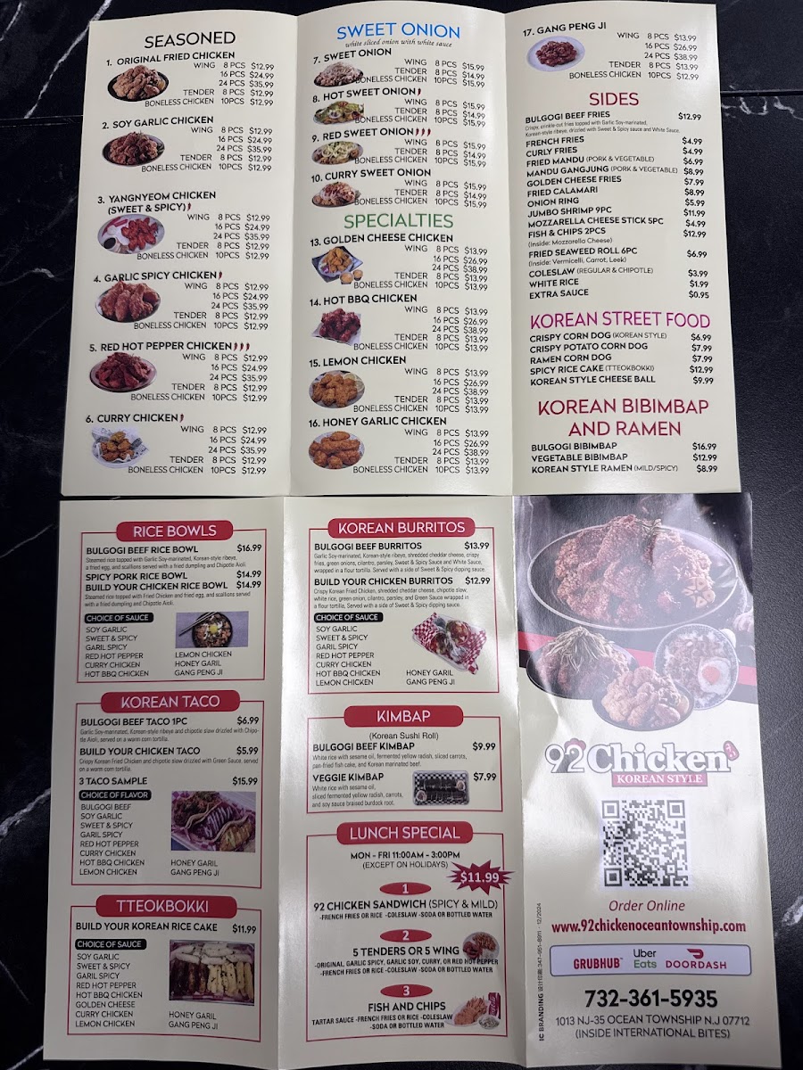 You'll find the 92 Chicken Menu tucked inside International Bites at 1013 NJ-35 in Ocean Township, but it doesn’t take long to realize why people keep coming back. The moment you look it over, you can tell it’s all about bold flavors and comforting bites. Their Korean-style fried chicken is the star, of course, and it comes out crispy, saucy, or somewhere perfectly in between, depending on what you’re craving. And while the chicken steals the spotlight, it’s easy to get pulled in by the sides too, especially the ones that balance all that crunch with something warm or refreshing.